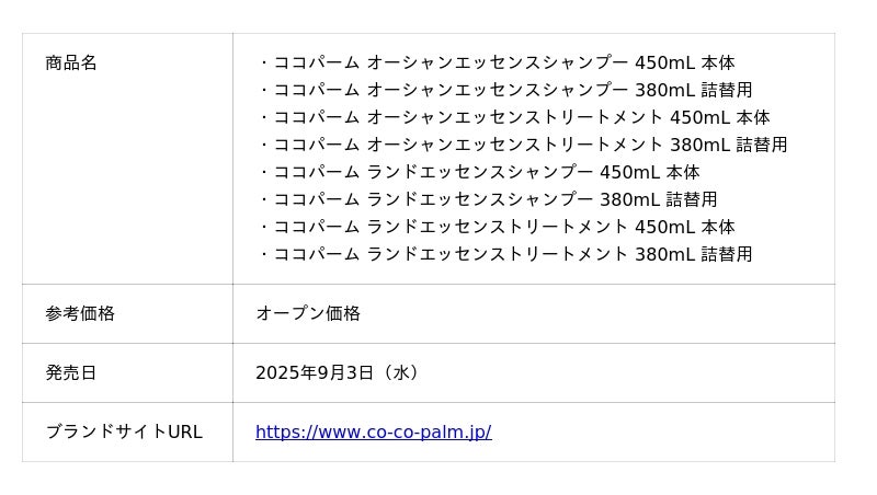 あわただしい日々の中だからこそ、ふと立ち止まり、自然の豊かさ・やさしさに包まれ“自然回帰”するバスタイムを、という想いを込めて商品開発した「COCOPALM」は、髪質に合わせて選べる2ライン<Ocean Essence(オーシャンエッセンス)><Land Essence(ランドエッセンス)>を展開。美しい地球を守るため、サステナブルヘアケアブランドととして、原料調達から排水に至るまで一貫して環境に配慮し、売上の一部でそれぞれ“海”と“大地”のコンセプトに合わせた社会貢献活動を実施しています。