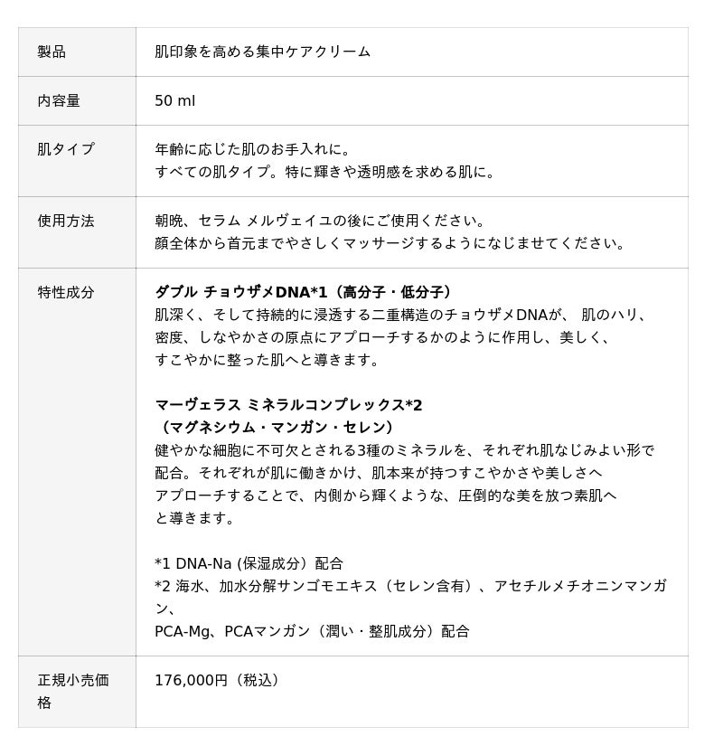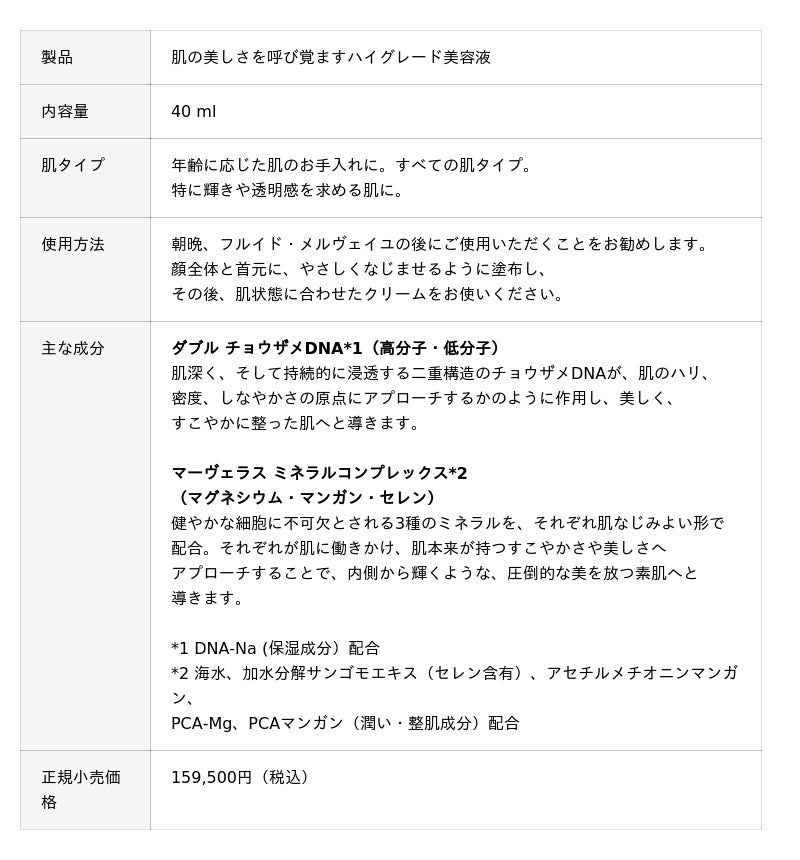 セラム メルヴェイユは、チョウザメDNAのデュオに加え、エッセンス オブ ゴールド スタージョン由来の3種のミネラルを配合。これらのミネラルは肌になじみやすく、内側から光を放つような輝きをもたらします。