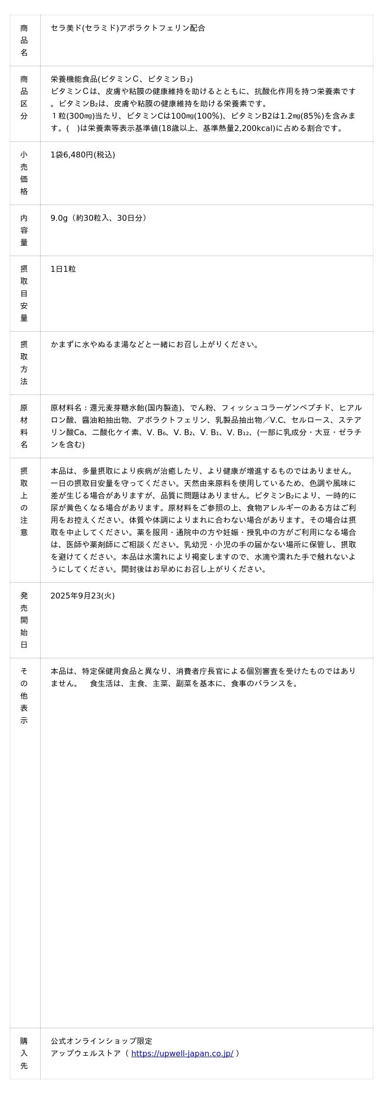 株式会社アップウェル(本社:福岡県福岡市、代表取締役社長:浜田光太郎) は、2025年9月23日(火)より、新美容サプリメント「セラ美ド(セラミド)アポラクトフェリン配合」をオンラインショップ「アップウェルストア」にて販売を開始いたします。※浜は旧字体です。