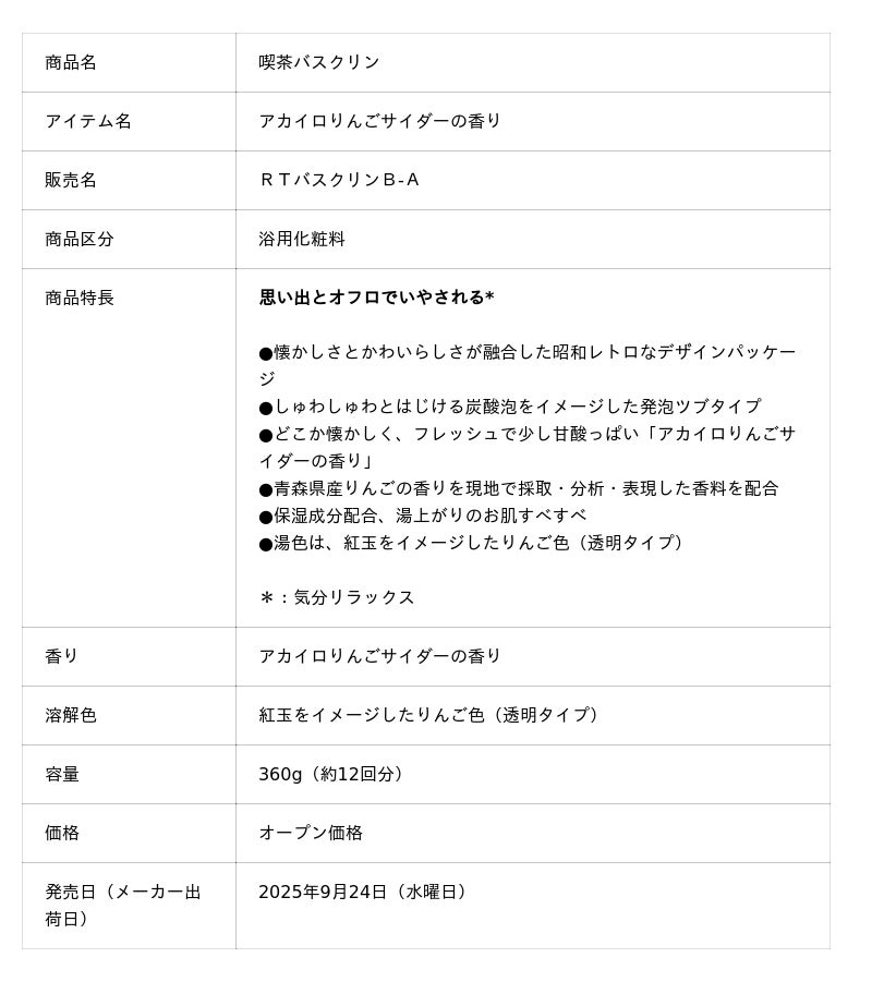 株式会社バスクリン(本社:東京都千代田区 社長:三枚堂正悟)は、昭和レトロをテーマにした入浴料「喫茶バスクリン アカイロりんごサイダーの香り」を9月24日(水曜日)より数量限定発売いたします。町の喫茶店で飲んだ“きらきらしゅわしゅわのりんごサイダー”を思い出させる炭酸泡、レトロかわいいパッケージとフレッシュで少し甘酸っぱい「アカイロりんごサイダーの香り」で、“懐かしくて新しい”特別なバスタイムをお届けします。