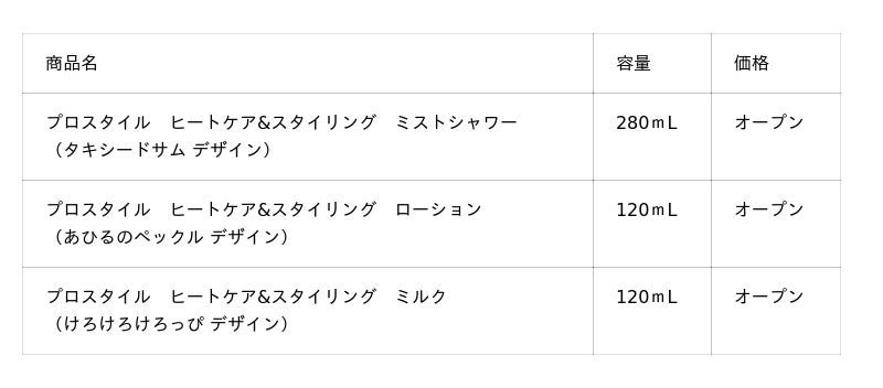 毛先までうるおい寝ぐせをリセットする「ミストシャワー」は「タキシードサム」、さらさらな指通りと理想の髪型をキープする「ローション」は「あひるのペックル」、しっとりうるおいを与え、柔らかにまとめる「ミルク」は「けろけろけろっぴ」とコラボ。それぞれのキャラクターたちが、ヘアアイロンを手に音楽に合わせてスタイリングを楽しむ姿が描かれており、毎朝のスタイリングの時間を明るく盛り上げてくれます。