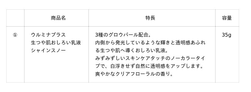 今回発売する「生つや肌おしろい乳液 シャインスノー」は、トレンドの「発光肌」を叶えるグロウタイプの数量限定品です。3種のグロウパールを配合し、光によって毛穴や色ムラ、くすみをカバーしながら、肌を内側から輝かせるような仕上がりを実現。ノーカラータイプのため、どんな肌色でも白浮きせずに使えます。