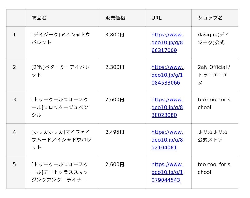 Qoo10(https://www.qoo10.jp/)サイト上、「アイブロウ」「リップメイク」「アイシャドウ」「チーク」カテゴリーの公式ショップ各販売個数に基づいたランキングです。