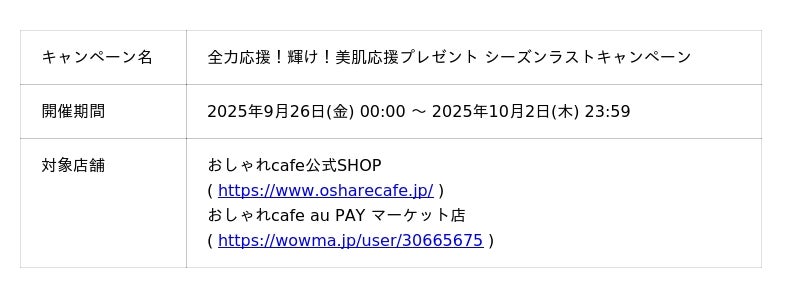 今シーズンの応援への感謝を込めて、豪華スキンケアセットや、おしゃれcafeの公式キャラクター「おしゃこ」のグッズが当たるシーズン最後のプレゼントキャンペーンを「おしゃれcafe 公式ショップ」と「おしゃれcafe auPAYマーケット店」の2店舗で実施します。特に公式ショップは当選確率が倍でねらい目です!思わず笑顔になるユニークな賞をご用意したので、ご参加お待ちしております。