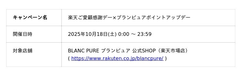 ピュアクリエイト株式会社(本社:埼玉県熊谷市)が運営するスキンケアブランド「BLANC PURE(ブランピュア)」は、2025年10月18日(土)に開催される「楽天ご愛顧感謝デー」に合わせ、同日限定でブランピュア楽天市場店の全品を対象としたポイント10倍キャンペーンを開催いたします。これにより、ご愛顧感謝デーの特典と合わせて、対象のお客様は最大でポイント13倍を獲得可能に。日頃ご愛顧いただいているお客様への感謝を込めた、大変お得な一日をご提供します。