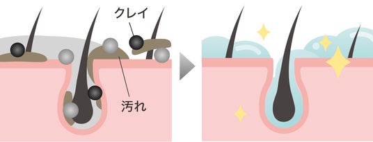 オイルが汚れを浮かし、クレイ*8が吸着。細かいスクラブ*9が不要な角質も除去します。頭皮や髪のダメージは最小限にしつつ、しっかり洗浄。