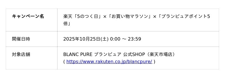 ピュアクリエイト株式会社(本社:埼玉県熊谷市)が運営するスキンケアブランド「BLANC PURE(ブランピュア)」は、2025年10月25日(土)に、ブランピュア楽天市場店の全品を対象とした「+ポイント5倍」キャンペーンを開催いたします。当日は、楽天カードご利用でポイントがアップする「5のつく日」であり、さらに「お買い物マラソン」の期間中でもあるため、3つのポイントアップ施策を組み合わせることで大変お買い得です。