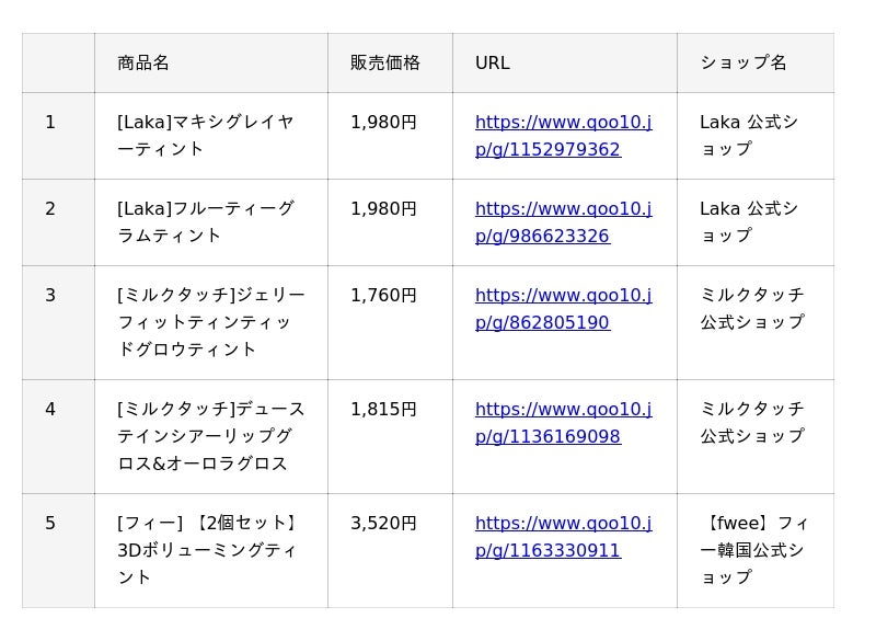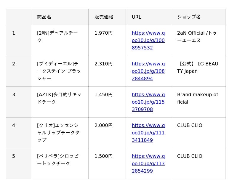 インターネット総合ショッピングモール「Qoo10」を運営するeBay Japan合同会社(本社:東京都港区、代表取締役:グ ジャヒョン)は、Qoo10で人気のコスメカテゴリーの中から、『リップ』『アイシャドウ』『チーク』と、月替わりで1アイテムをピックアップした、月間販売数TOP5※をご紹介していきます。