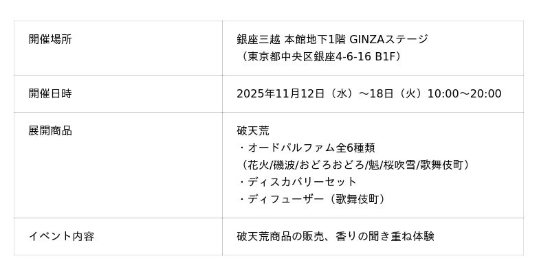 日本製の香りのモノづくりを手がける株式会社キャライノベイト(本社:東京都台東区、代表取締役:清水篤)は、11月12日(水)~11月18日(⽕) 銀座三越 本館地下1階 GINZAステージにて、日本を代表する芸術作品の浮世絵からインスパイアを受けたデザインと香りが魅力の<破天荒>の体験型POP UP イベントを開催いたします。