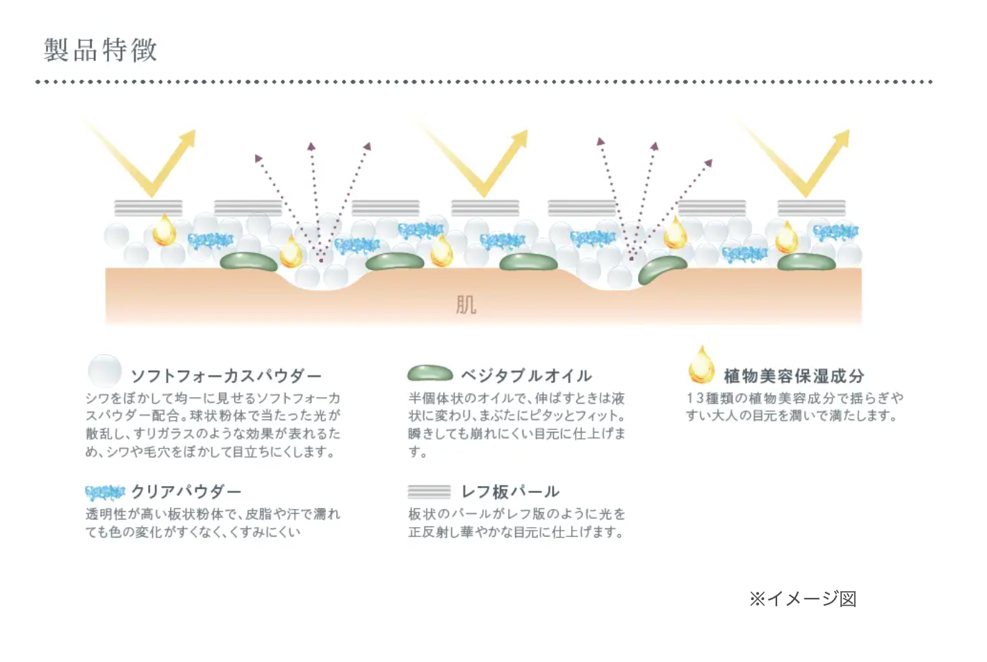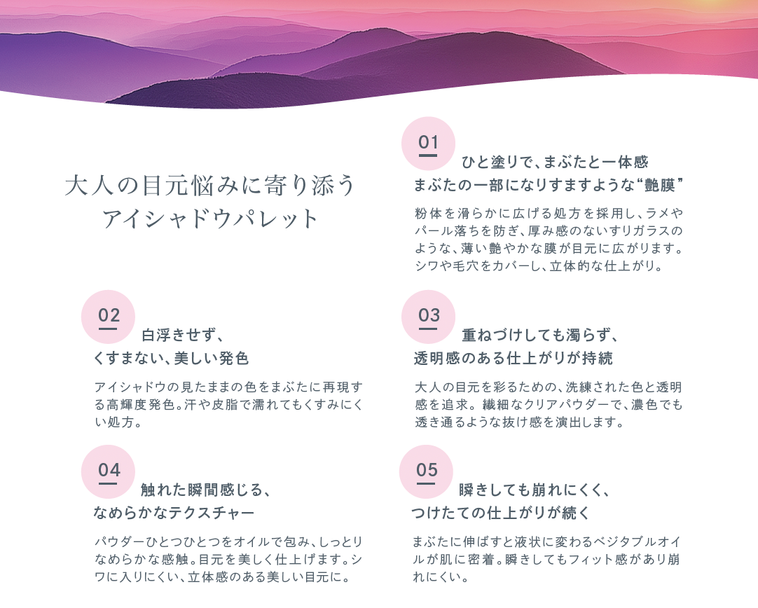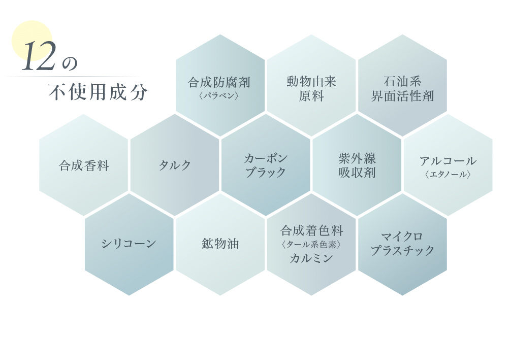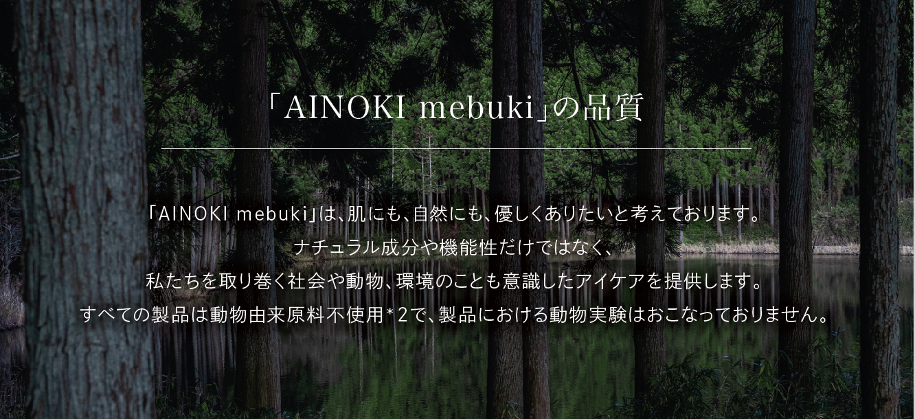 瞳が美しく映える肌の為に必要な成分を配合。敏感肌の人でも心地よく使えるように、天然由来成分90%以上、フリー処方などブランド独自の基準を設け自然や動物にも優しいブランドを目指しています。