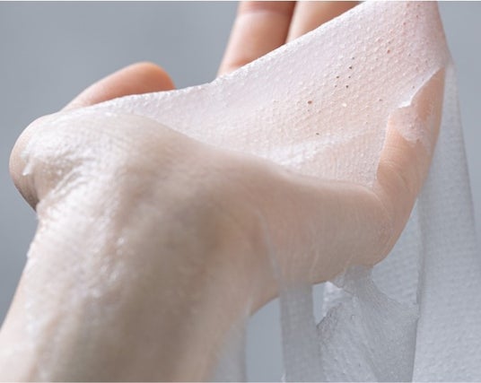 高密度な特殊不織布を採用し、美容液がコラーゲンのようなジェル触感へと変化します。肌への高い密着性と通気性を同時に実現した、快適な使い心地で、うるおいを長時間保つことが可能です。