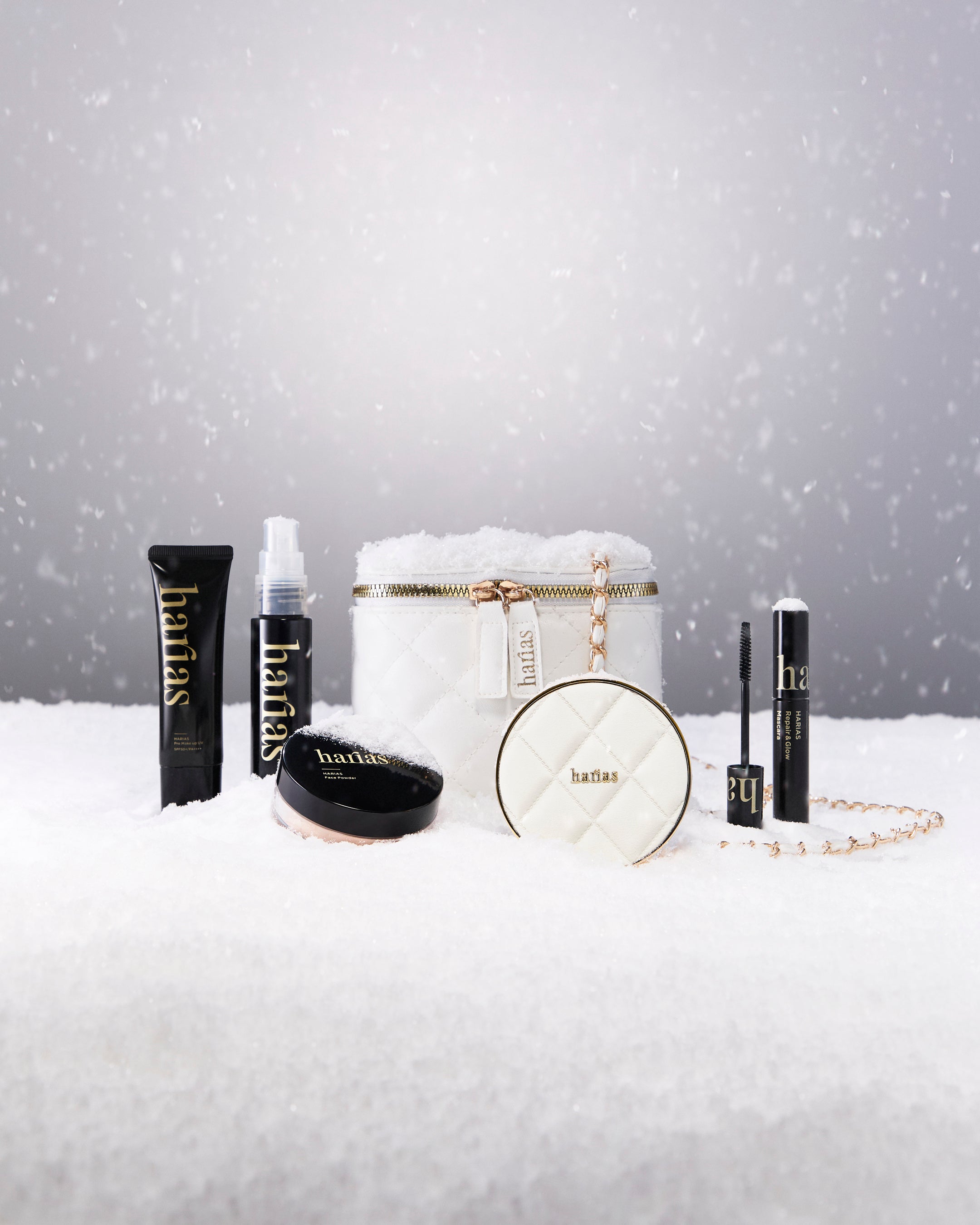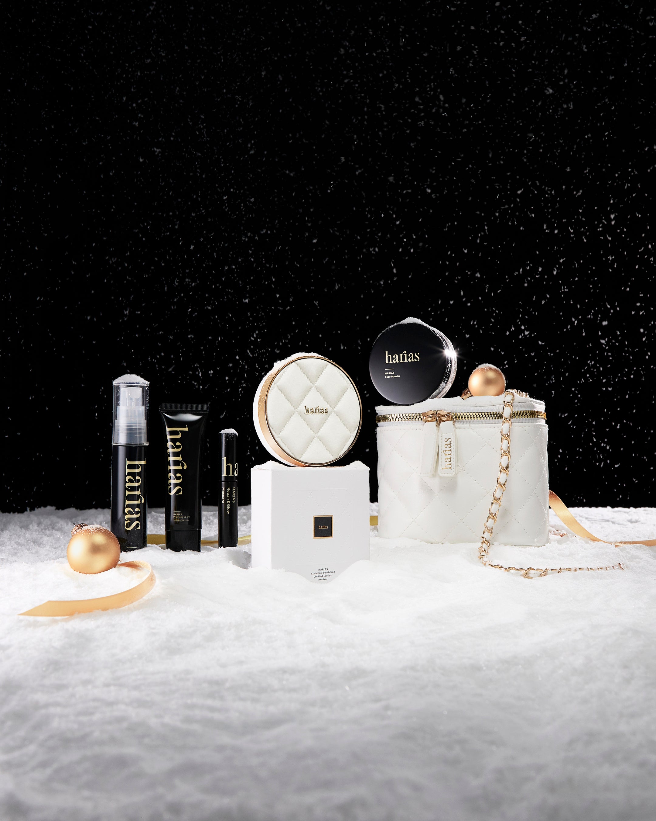 HARIASホリデーコフレ「オリジナルミニチェーンバッグ」「HARIAS薬用クッションファンデーション – Holiday Limited Edition -」「HARIASラインナップアイテム」を組み合わせた贅沢なセットです。