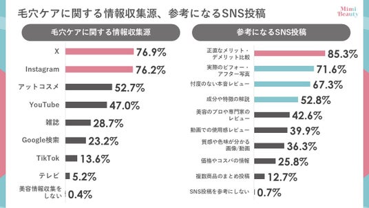 – 毛穴ケアの情報源は「X」、「Instagram」、参考になる投稿は「正直なメリット・デメリット比較」、「ビフォー・アフター」、「成分解説」