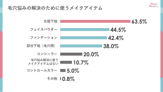 毛穴悩みの解決のために使う「メイクアイテム」についても調査したところ、最もポイントが高いのは「化粧下地」で63.5%でした。毛穴隠しに特化した「部分下地」も38.0%の人が使っていることから、「下地」による毛穴隠しが美容オタクには一般的であることが分かります。