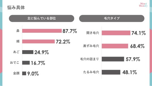 続いて、顔の毛穴で悩んでいる人に対して、悩んでいる部位について調査したところ、「鼻」が1位で87.7%、次いで頬が72.2%という回答でした。さらに、毛穴悩みのタイプについても調査したところ、「開き毛穴」が最も多く、74.1%という結果でした。その他に「黒ずみ毛穴」、「毛穴の詰まり」、「たるみ毛穴」を選ぶ人も半数近くいることから、「毛穴悩み」には、複数の部位において複数の毛穴タイプが存在し、複合的な悩みを抱えている人がいることが分かります。