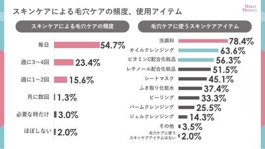 最も実践者の多い「スキンケアによる毛穴ケア」について、頻度を聞いたところ「週1回以上」と回答した人の合計は93.7%にのぼりました。「毎日」と回答した人も54.7%と半数を超えていることから、毛穴ケアは日々のスキンケア習慣として根付いていることが分かります。さらに「毛穴ケアに使うスキンケアアイテム」についても調査したところ、最も使用されているのは「洗顔料」、次いで「オイルクレンジング」、「ビタミンC配合化粧品」という結果でした。