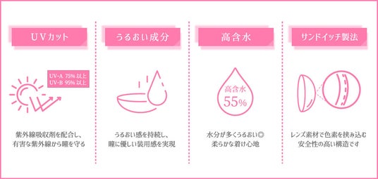 3.UVカット機能、うるおい成分など瞳に優しいレンズスペック