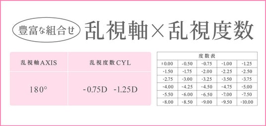乱視軸、乱視度数、近視度数を豊富な組合わせで取り扱い、個々の視力や目の形状に最適なレンズを提供します。