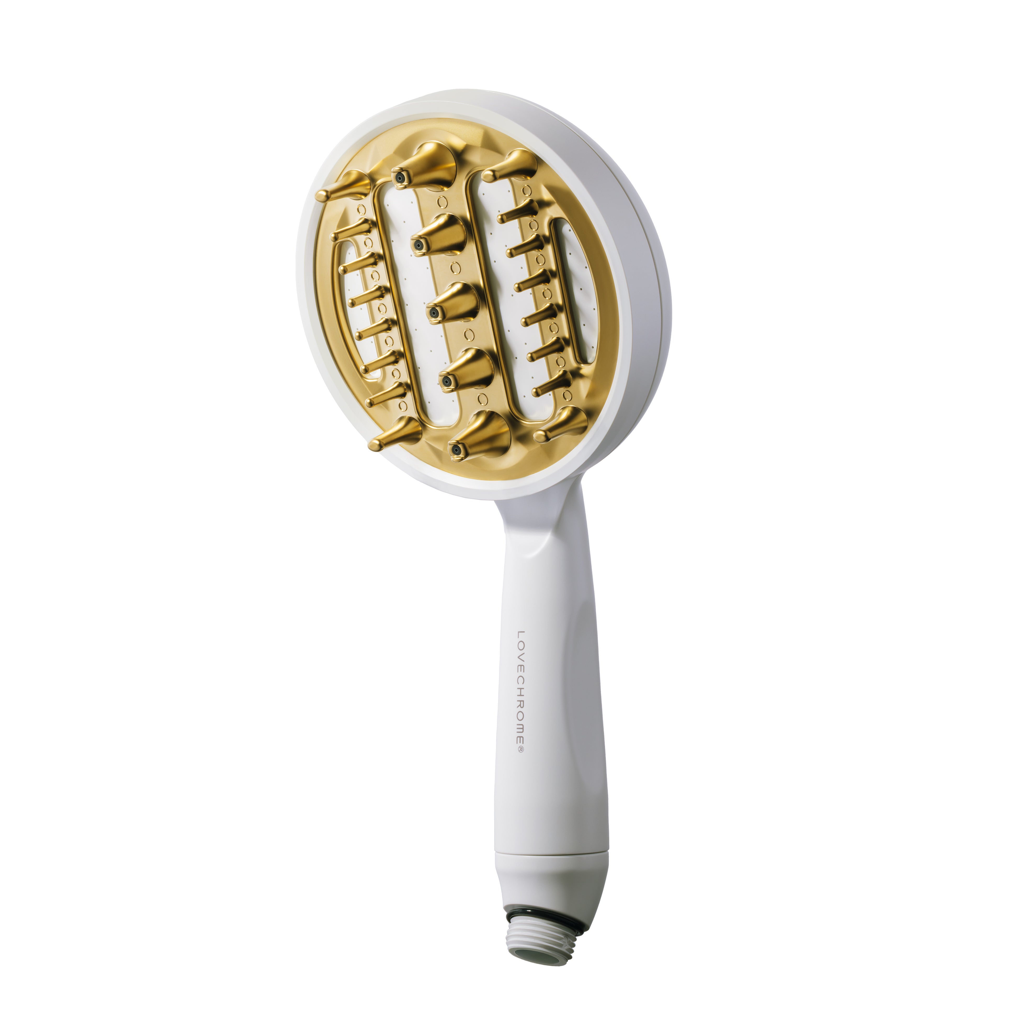 ラブクロム 美頭髪シャワーヘッドは、ラブクロム独自のなめらかな表面加工を施したヘアコームをシャワーヘッドに融合。頭皮のかたちに沿うノズル形状で、毛穴よりも小さなバブルをコーム型ノズルから頭皮に直接届け、毛穴に潜む汚れをしっかりと洗浄します。