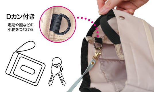Dカン付きで定期や鍵などを取り付ければバッグの中を探す必要がありません!