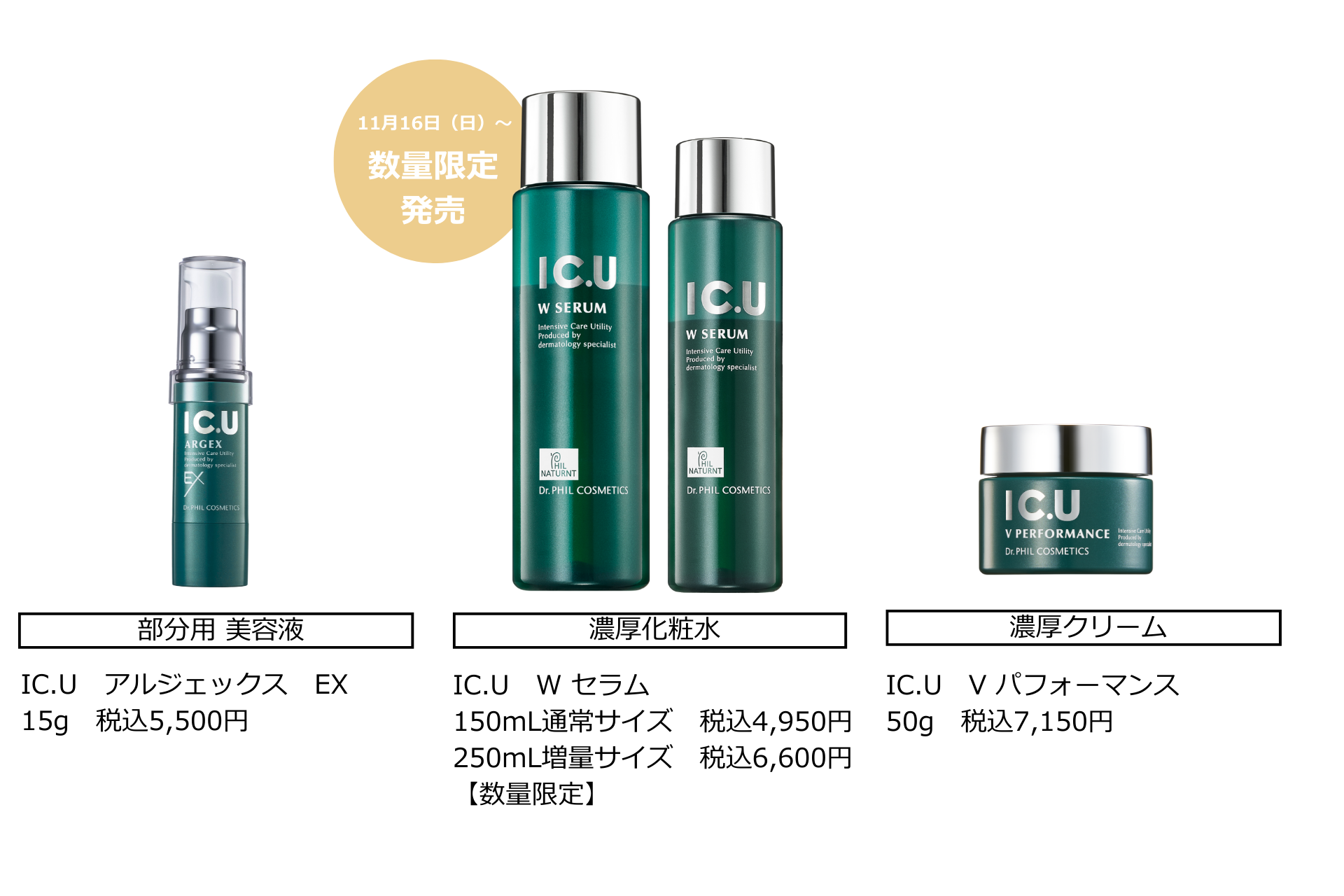 『IC.U』は、皮膚の専門家の幅広い知見とコーセーグループの技術力のもと、年齢にとらわれず前向きに輝く大人のために生まれたエイジングケア※1ブランドです。誕生以来、10年先も輝く素肌を目指してスキンケアの可能性に挑戦。話題のPDRN※2を配合し、年齢サイン※3を全方位に集中ケアする部分用 美容液「IC.U アルジェックス EX」、速攻的にリッチなハリ・ツヤを叶える2層タイプの濃厚化粧水「IC.U Wセラム」、ゆるみシグナル※4にアプローチし上向きな印象のハリ肌に導く濃厚クリーム「IC.U V パフォーマンス」、貼って寝るだけで目もとのハリ・うるおい・透明感を集中ケアするマイクロニードルパッチ「IC.U HA マイクロパッチ AX フィラー」の4品を発売しています。