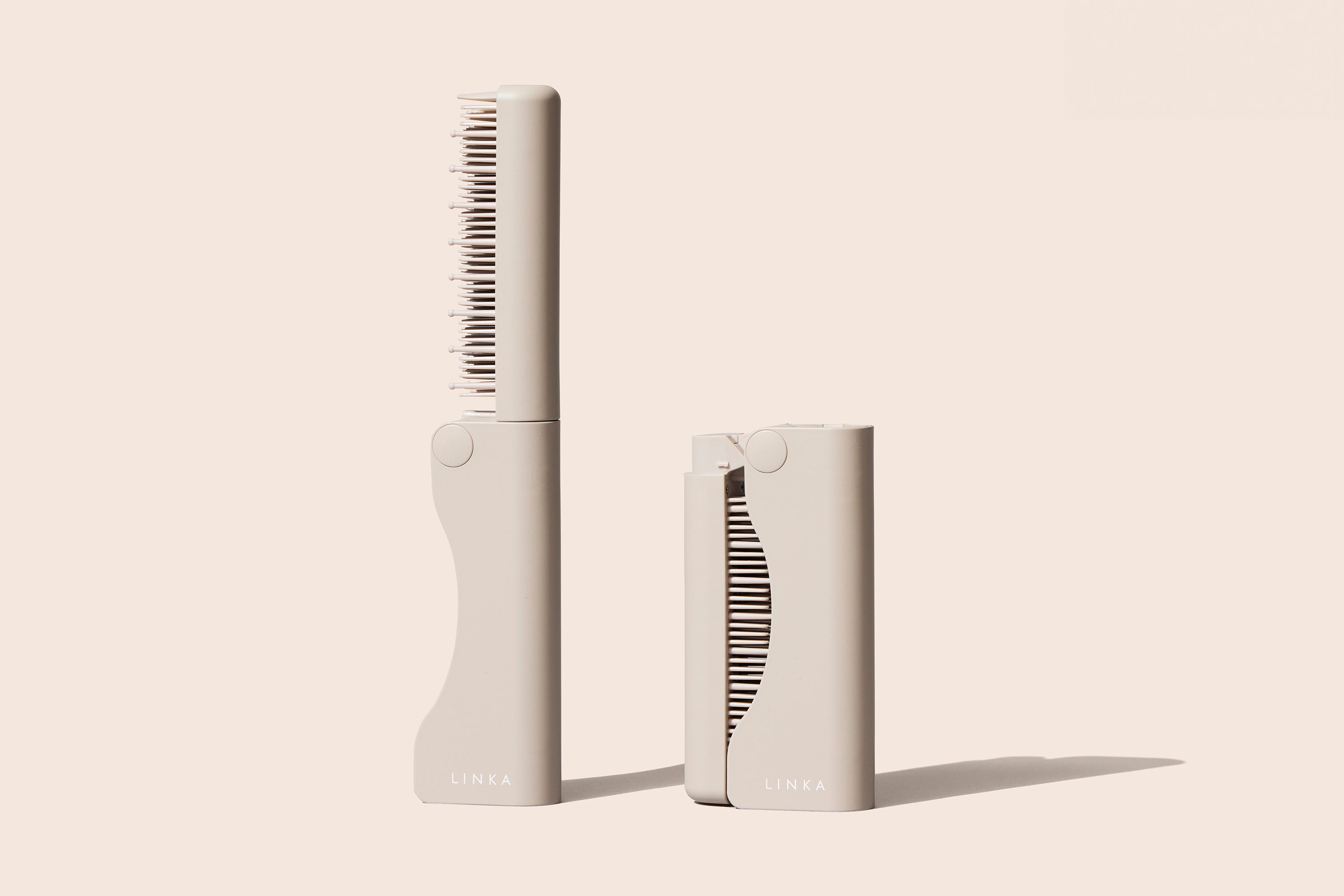 LINKA スリークオン ヒートブラシは折りたたみが可能な充電式ヒートヘアブラシです。重さ約135gの超軽量設計、スマホよりも小さなサイズ感で、外出先でもサッと取り出して自由なスタイリングが可能です。