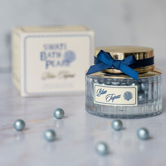 ジュエリーのように輝くバスパールを、美しいガラスボトルに閉じ込めました。シトラス&ムスクの香りの限定カラー〈ブルー〉は大人っぽいシックな色合い。香りと輝きで満たすラグジュアリーなバスタイムを。