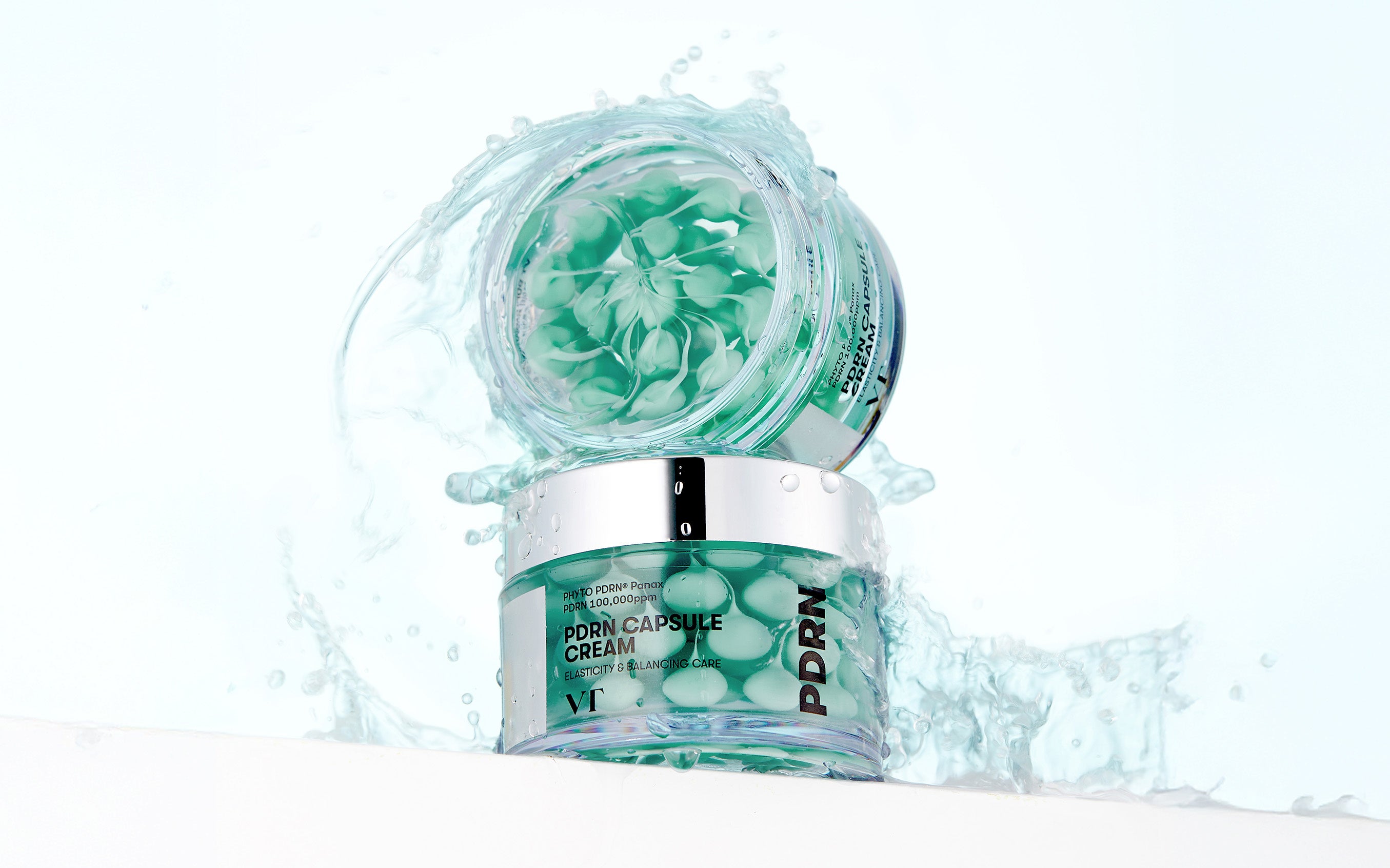 SNSでも話題の「VT PDRN カプセルクリーム100」は、見た目だけでなく機能面でも満足度の高いアイテムです。ミント色のカプセルには植物由来のPDRN※3がたっぷり配合され、透明感※8のある肌へと導きます。また、透明ジェルにはヒアルロン酸※10やセラミド※4などの保湿成分を配合し、鼻・口周りや眉間の角質ケアに活用するのもおすすめ。