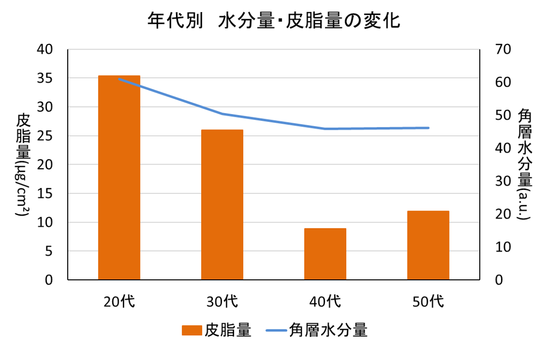 年齢を重ねると肌の皮脂量や水分量に変化が現れ、50代の肌の水分量は20代に比べると約30%減少し、皮脂量は約60%減少します。水分量や皮脂量が減ることで、肌が乾燥したり、角層が厚くなってごわついた肌になることで、「角層吸収力※3」が弱くなります。当社はその「角層吸収力※3」に着目し、メークや毛穴汚れを落とすだけでなく、肌をうるおいで柔らかくほぐし、次に使うスキンケアが浸透しやすい肌環境に整えることができるクレンジングオイルの開発に取り組みました。