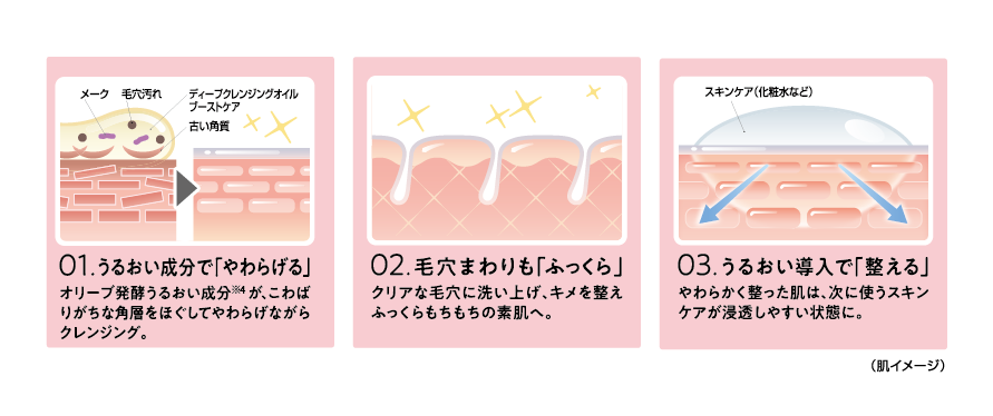 「DHC ディープ クレンジング オイル ブーストケア」は、年齢を重ねると弱くなる「角層吸収力※3」に着目し、スキンケアをなじみやすくするブースター機能※2を搭載した“新発想”クレンジングオイルです。厳選した<オリーブ発酵うるおい成分※4>の配合と発酵ケアテクノロジーの力で、クレンジングしながら角層をうるおいでやわらかくほぐし、スキンケアが浸透しやすい肌へと整えます。