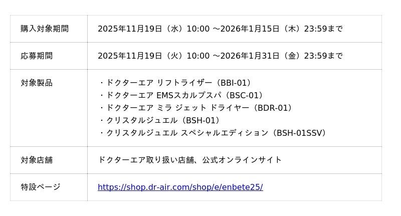 全国約4,000店で取り扱われているトータルボディケアブランド『ドクターエア』では、美容ライン「DOCTORAIR BEAUTY」において、2025年11月19日より新製品発売を記念した「ドクターエア ビューティシリーズ 発売記念キャンペーン」をスタートします。