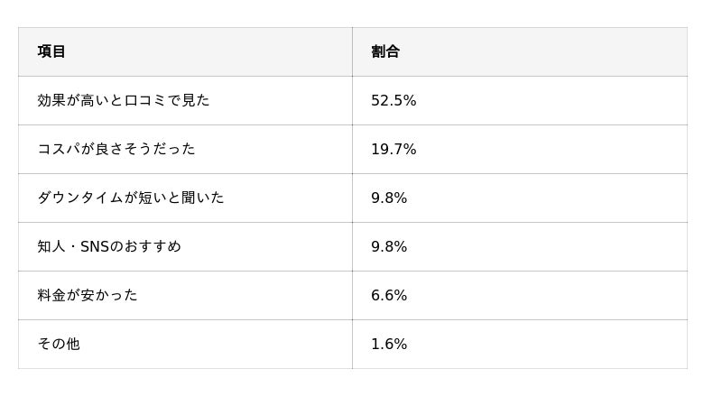 施術を選んだ理由としては、「効果が高いと口コミで見た」が52.5%と最多。SNSや口コミを参考にしたという回答も一定数見られました。