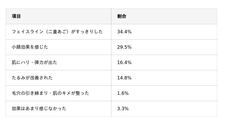 最も多かったのは「フェイスラインがすっきりした」(34.4%)で、小顔効果(29.5%)やハリ感(16.4%)など、顔まわりの変化に関する回答が多く見られました。