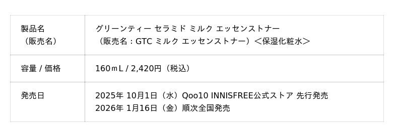 *¹ Qoo10 INNISFREE公式サイト内での口コミ評価(2025/10/1~11/25) *² 洗顔後にすぐつけてケアすること *³ 使用感のこと(自社製品内において)*⁴ in vitro試験結果:スーパーグリーンティー(TM)と一般的なヒアルロン酸の有用性の比較(社内比較)、原料特性による *⁵ チャ葉エキス、チャ種子油(全て保湿成分)*⁶ 角質層まで *⁷ セラミドNP(保湿成分)*⁸ Qoo10 INNISFREE公式サイト内での口コミ評価(2025/10/13~11/25)