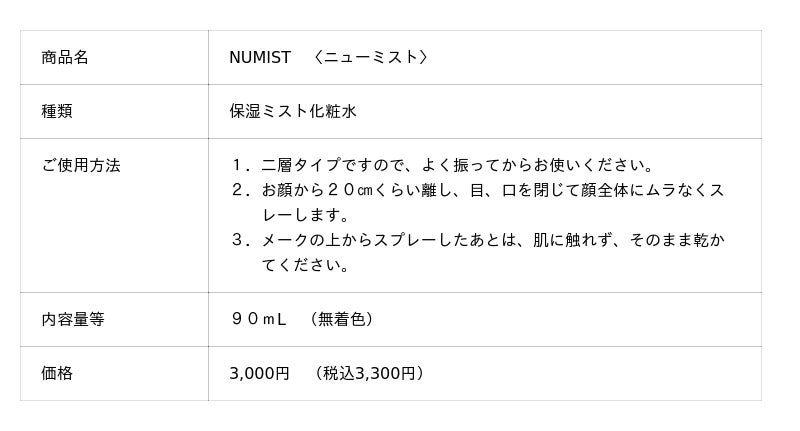 NUMISTは、「ふって(振って・吹って)うるおいチャージ。メークの上からでもツヤ肌キープ」をコンセプトに誕生しました。