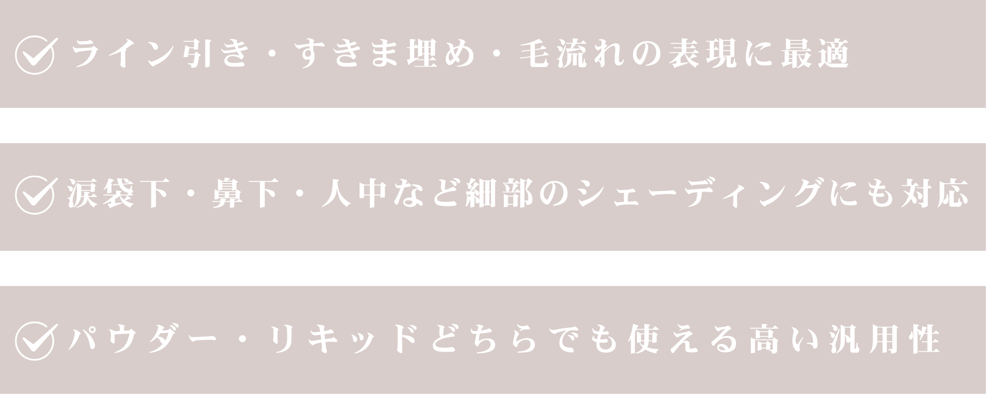 描く部位や用途に合わせて毛質や形状を変えるこだわりの設計により、眉毛1本1本を繊細かつ自然に仕上げ、プロユースの精度をそのまま再現できる1本です。