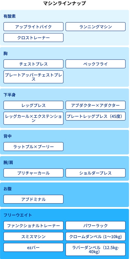 一般的には月額1万円ほどの高価格帯ジムで使用されることが多いハイグレード機器を、誰でも気軽に使える環境として開放しています。