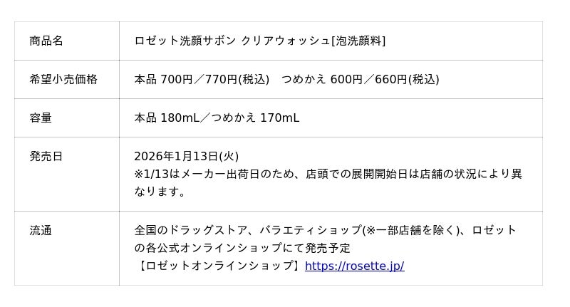ロゼット株式会社(本社:東京都品川区、代表取締役社長:藤井 敬二)は、泡洗顔ブランド『ロゼット洗顔サボン』から、角栓・テカリをごっそりオフする「ロゼット洗顔サボン クリアウォッシュ」を2026年1月13日(火)より発売いたします。
