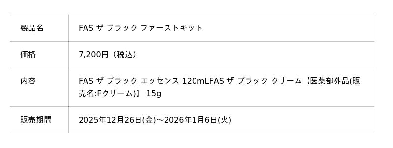 FASを初めてご購入される方を対象としたスペシャルキット「FAS ザ ブラック ファーストキット」を、ジェイアール名古屋タカシマヤのPOP UP内にて特別にお買い求めいただけます。