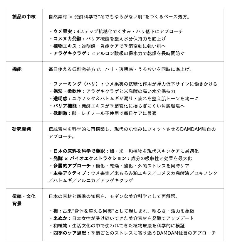 本製品は、和歌山県産の紀州南高梅を用いた 4ステップ抗糖化システム、2種類の米ぬか発酵エキス *1、ユキノシタ 2、ハトムギ 3、アルニカ *4、アラゲキクラゲ *5などの日本植物を中心に組み合わせた配合が特徴。発酵技術とバイオエクストラクションによって、酸やレチノールに頼らず“引き締め・弾力・透明感”を叶えるDAMDAMらしい機能性エイジングケア美容液です。