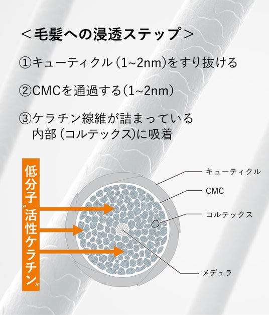 そのため、髪に浸透しやすく、且つ吸着しやすいという特長を持ち、毛髪内部から補修できる構造になっています※1。