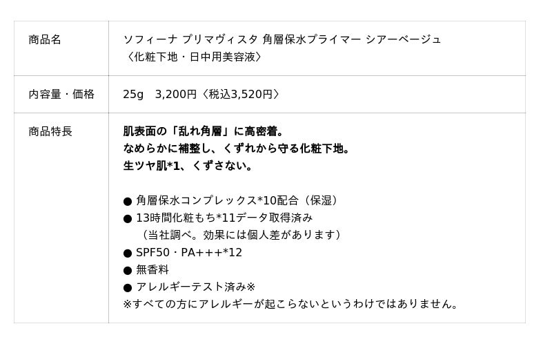 『ソフィーナ プリマヴィスタ 角層保水プライマー』は、肌表面の「乱れ角層」に高密着し、なめらかに補整することで、くずれから守る化粧下地です。また、世界初*9の成分アプローチを採用。花王独自の密着保水膜が肌表面の「乱れ角層」に高密着し、きめの乱れやかさつき、毛穴による凹凸をなめらかにカバーし、くずれから守ります。また、密着保水膜の保水効果で、みずみずしくうるおった肌が持続します。