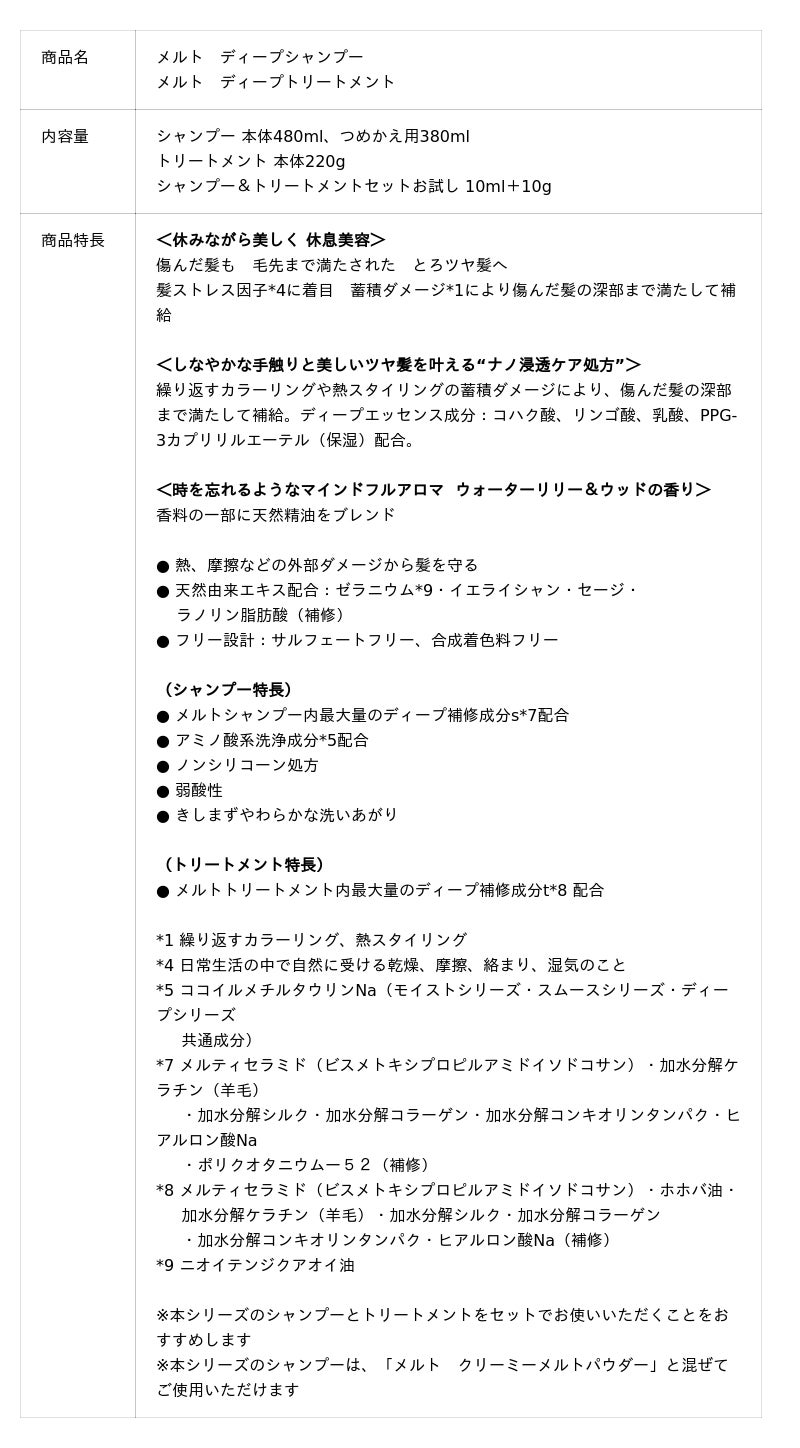 「melt」“ディープシリーズ”は、繰り返すカラーリングや熱スタイリングによるダメージの蓄積に着目。髪表面とともに内側の深部まで満たして補給することで、傷んだ髪でも毛先まで満たされたとろツヤ髪に仕上げます。
