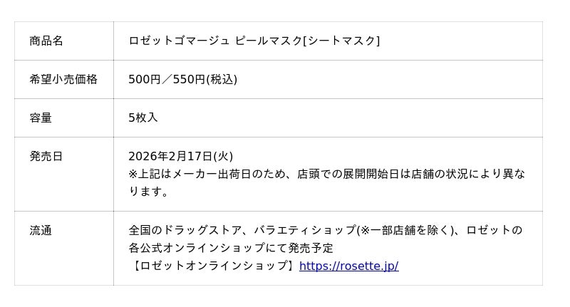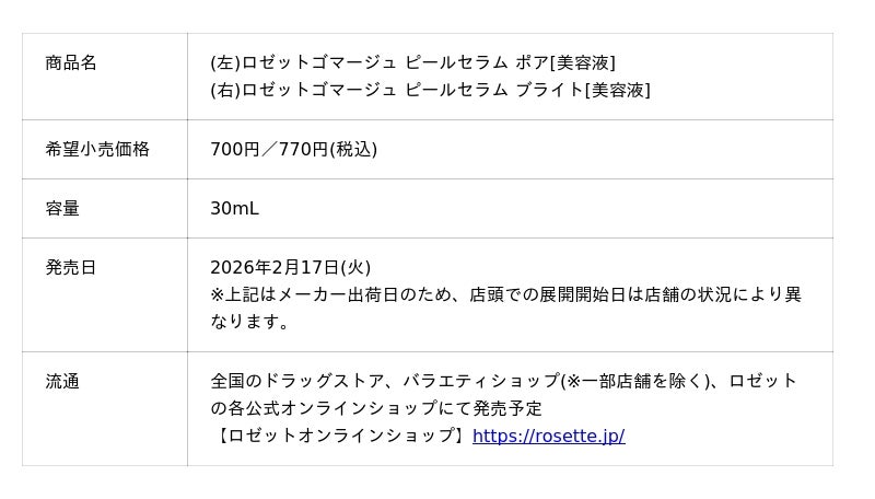 ロゼット株式会社(本社:東京都品川区、代表取締役社長:藤井 敬二)は、角質ケアブランド『ロゼットゴマージュ』から、3つの新商品「ロゼットゴマージュ ピールマスク」「ロゼットゴマージュ ピールセラム ポア」「ロゼットゴマージュ ピールセラム ブライト」を2026年2月17日(火)より発売いたします。