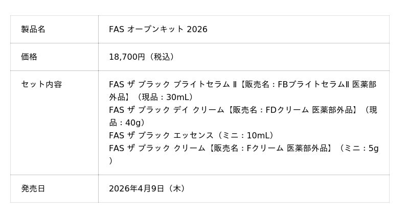 “居残りメラニン*³”へのアプローチと戻り光量の引き上げで、大人のエイジングくすみ*⁴に立ち向かう新作の美白美容液「FAS ザ ブラック ブライトセラム II(医薬部外品 / 販売名:FBブライトセラムII)」と、SPF50+ / PA++++のハイスペックなUVカット機能を搭載しつつ、高いスキンケア効果も備えた「FAS ザ ブラック デイ クリーム(医薬部外品 / 販売名:FDクリーム)」がセットになったキットです。「FAS」のデビュー以来長く愛される定番アイテムの「FAS ザ ブラック エッセンス」と「FAS ザ ブラック クリーム(医薬部外品 / 販売名:Fクリーム)」がミニサイズで付いてきます。