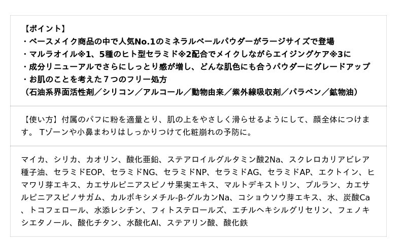 今回は成分もリニューアル。肌へのやさしさや軽いつけ心地はそのままに、独自のモイスチャーマイカ、肌色補正パウダーを追加配合しました。