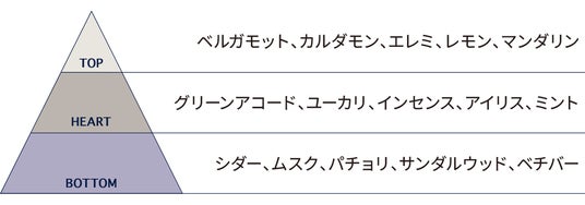 ウッディ&ムスキーの落ち着きの中に、シトラスやグリーンアコード、アイリス、サンダルウッドなどが静かに息づきます。