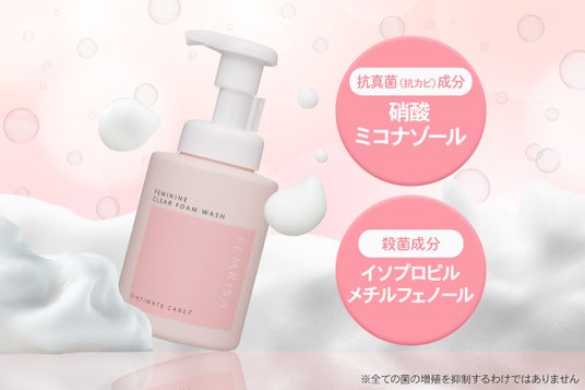 本商品は“原因菌へのアプローチ”と“やさしさ”を両立した処方設計が特長です。抗真菌(抗カビ)成分であるミコナゾール硝酸塩と殺菌成分であるイソプロピルメチルフェノールを配合したW処方で、ニオイやムレなどのトラブルの原因にアプローチし、肌を清潔に保ちます。さらに洗浄後の乾燥にも配慮し、ナイアシンアミド※2などの保湿成分を配合。アミノ酸系洗浄成分をベースに、泡立ちと高い保湿力を両立し、デリケートな肌をやさしく洗い上げます。泡タイプで無香料設計のため、毎日のケアに取り入れやすいフェムケアアイテムです。