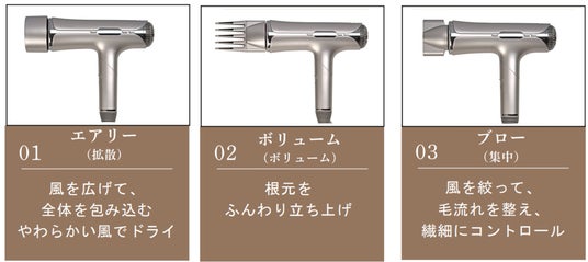 KINUJOはこれまで、髪のうるおいや艶に着目し、毎日のスタイリング時間そのものを心地よく、美しさにつながる時間へと変えていく製品づくりを目指してきました。一方で、生活者の間では、ドライヤーに求める価値が大きく変化しています。富士経済「グローバル家電市場総調査 2025」美容・健康家電/雑貨の国内市場を調査によると、ドライヤーは“乾かすための機器”ではなく、“髪を整え、仕上がりを高めるためのアイテム”として選ばれるようになりました。そこで今回KINUJOは既存モデルの大風量・軽量・コンパクト設計をベースにしながら、さらに仕上がりの質感に着目したハイエンドモデルを開発。3レイヤーのシルクテクノロジーを搭載し、速乾性に加え、さらさらしっとりとした質感や美しいまとまりを追求しました。また、初搭載となる「ボリュームモード」「ケアモード」のモード切替と、「エアリー」「ボリューム」「ブロー」といった3種の付属のアタッチメントにより、その日の髪状態やなりたい仕上がりに応じた使い分けも可能となりました。