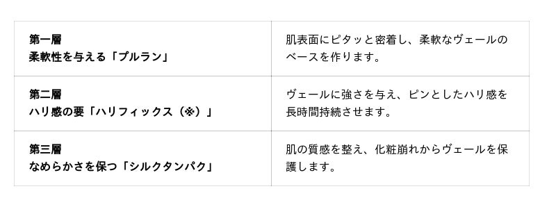 独自の「三層ロックヴェール設計」による物理的なホールド効果。プルランをはじめとする3つの密着成分が、健やかな肌印象をキープします。※物理的効果による
